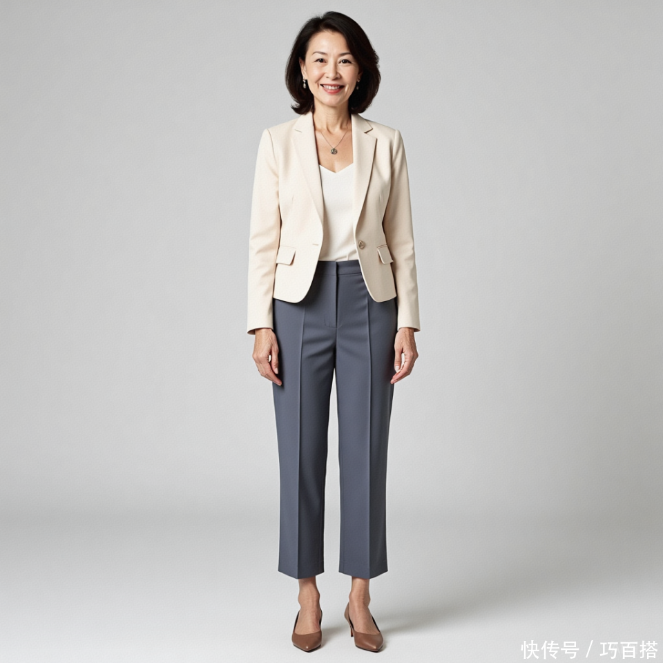 在ins上爆火的“3:7穿搭法”非常适合我们借鉴:短款米白色夹克(占3分)搭配灰蓝色九分裤(占7分),这种组合能在视觉上增高约5厘米。